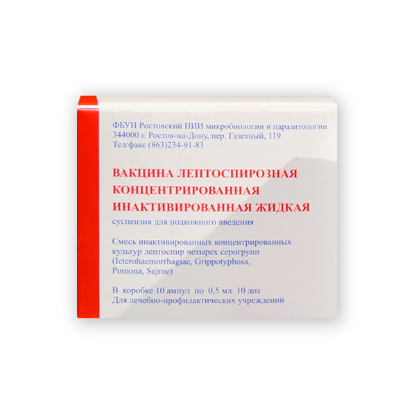| вакцина для профилактики лептоспироза (содержит смесь инактивированных концентрированных культур лептоспир четырех серологических групп: L. interrogans Icterohaemorraghiae copenhageni, L. interogans Grippotyphosa grippotyphosa, L. interrogans Pomona mozdoc, L. interrogans Sejroe sejroe) | 0.5 мл |